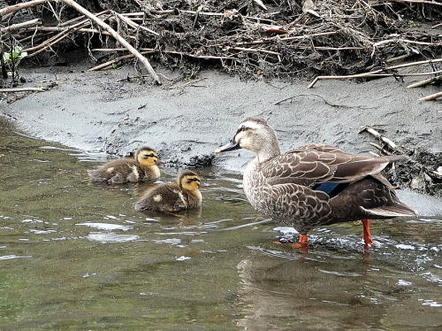 | コチドリ[6月22日] ヒナは3羽居るのが確認できましたが遠いです。 | カルガモ[6月22日] 4羽連れです。 | |