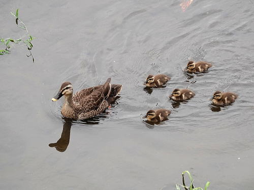 | カルガモ[6月17日] 5羽のヒナ連れが泳いで来ました。 | カルガモ[6月17日] 先日の7羽連れでしょうか。 | |