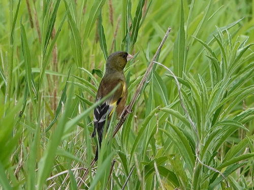 | ダイサギ[6月17日] 田んぼにはダイサギ2羽、コサギ1羽がいました。 | カワラヒワ[6月17日] 枯れ草の種を食べている様子でした。 | |