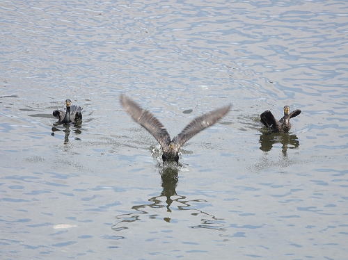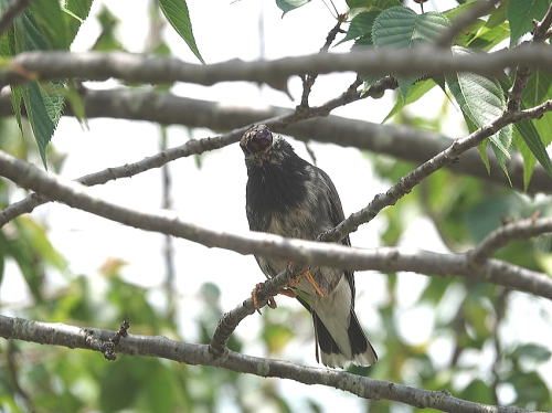 | カワウ[6月1日] 3羽で漁をしていました。大物は獲れなかったようです。 | ムクドリ[6月1日] 熟れたサクランボを口いっぱいに咥えて飛んで行きました。 |
