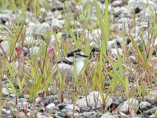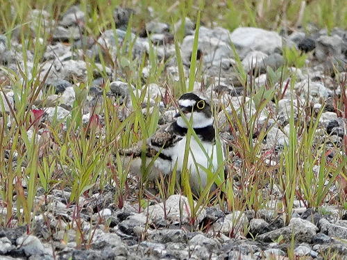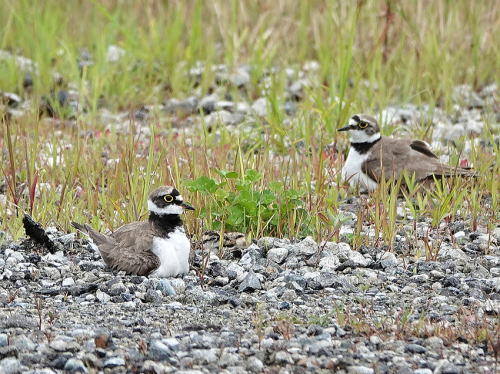 | コチドリ[6月10日] 賑やかな声が聞こえて来ました。ヒナが孵ったようです。 | コチドリ[6月10日] 親が動きました。分かりにくいですが3羽写っています。 | |