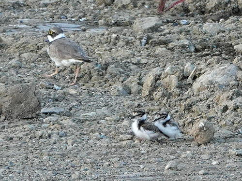 | コチドリ[6月29日] ヒナは幼鳥になっていました。 | コチドリ[6月29日] 左1羽が親、右2羽が幼鳥です。 | |
