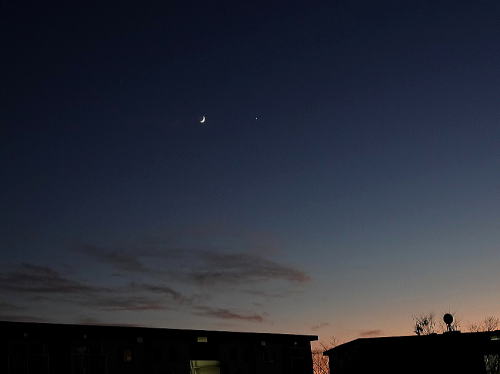 | ダイサギ[12月5日] 薄暗くなっても採餌中の様子でした。 | 三日月、金星[12月5日] 三日月のすぐ右に金星が輝いています。 | |