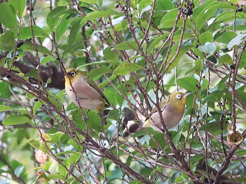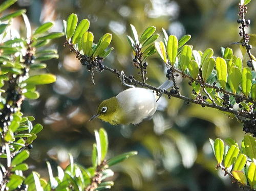 | モズ[12月30日] はやにえを食べに来ました。よく覚えていますね。 | メジロ[12月30日] 黒い小さなヒサカキの実を食べに来ました。 | |
