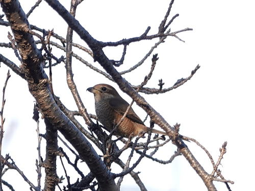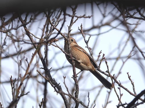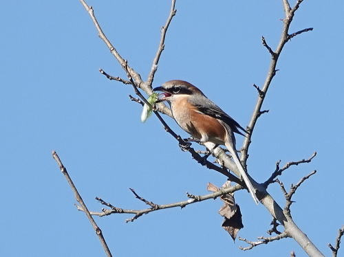 | オナガ[12月2日] 賑やかさが戻って来ました。 | モズ[12月2日] バッタのようなものを獲り、一口で飲み込んだようです。 | |