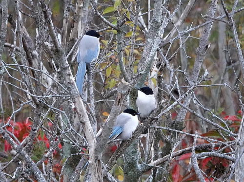 | ルリビタキ[12月10日] この岩に何度もやって来ました。 | オナガ[12月9日] 夕方の水浴びに次々と集まって来ます。 | |