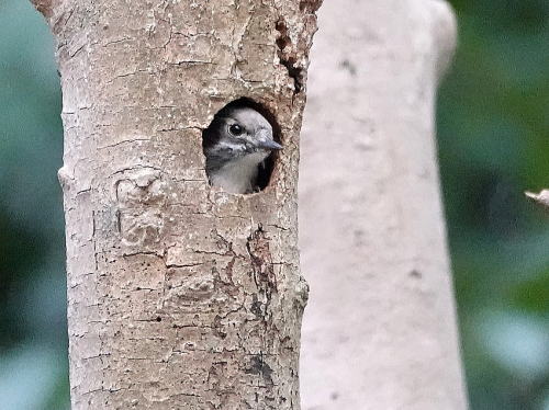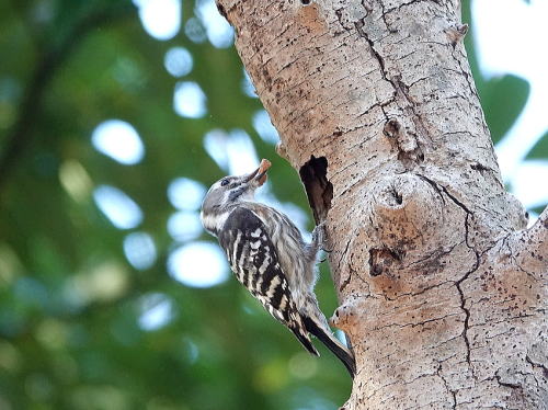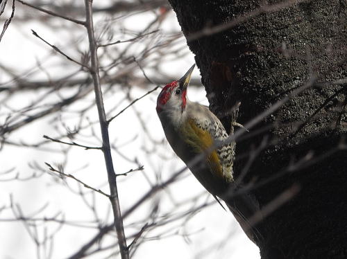 | コゲラ[1月9日] 長い間止まって覗き込んだり、突いたりしていました。 | コゲラ[1月9日] 何かを取りましたが、木屑か獲物か分かりません。 | |
