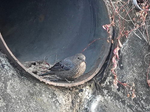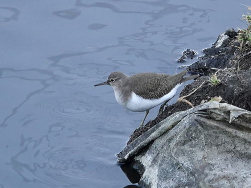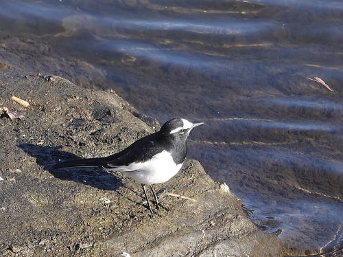 | バン[1月23日] すぐ横を川の中を走るダンプカーが行き来していますが気にしません。 | イソヒヨドリ[1月23日] すぐ前をざぶざぶとダンプカーが走りますが平気です。 | |