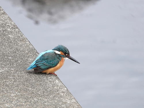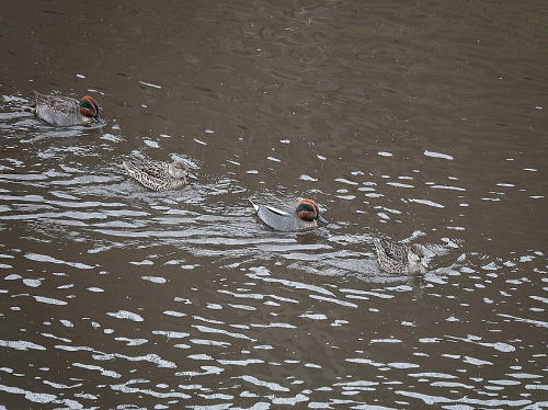 | コガモ[1月27日] 餌場を探して移動中のようです。 | カワセミ[1月27日] 水が濁っているので難しそうです。 | |