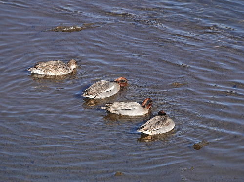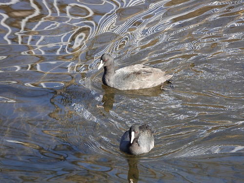 | ユリカモメ[1月21日] 少なくなりました、3羽です。河川改修工事をやっているからかも。 | カルガモ[1月21日] 今日は活発でした。 | |