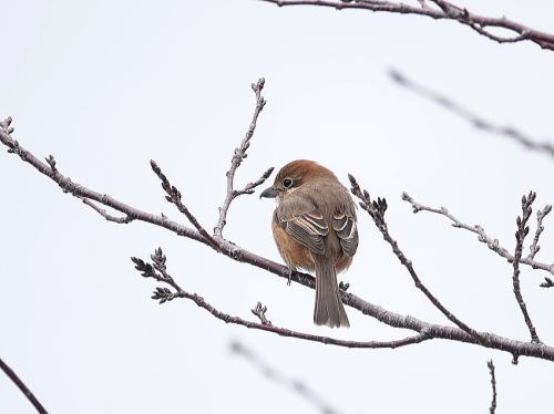 | モズ[1月27日] 未だ堅い蕾の桜の木でキーキー鳴いていました。 | コサギ[1月24日] 小さな池の上で休憩中です。 | |