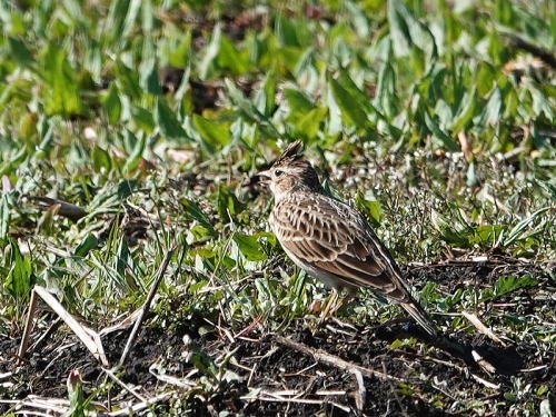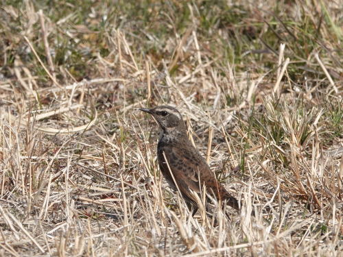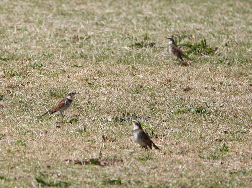 | ヒバリ[3月17日] 3、4羽いました。採餌に夢中でした。 | ツグミ[3月17日] 集まり始めました。この辺りには十数羽集まっていました。 | |