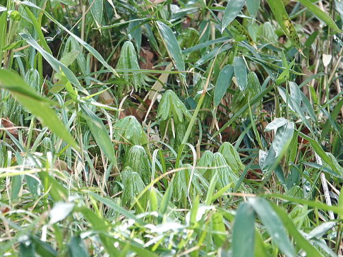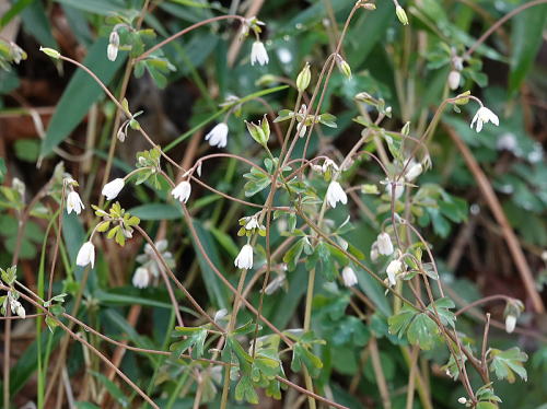| ヤブレガサ[3月28日] 今朝の雨で濡れていました。 | ヒメウズ[3月28日] 満開を過ぎたところです。 | |