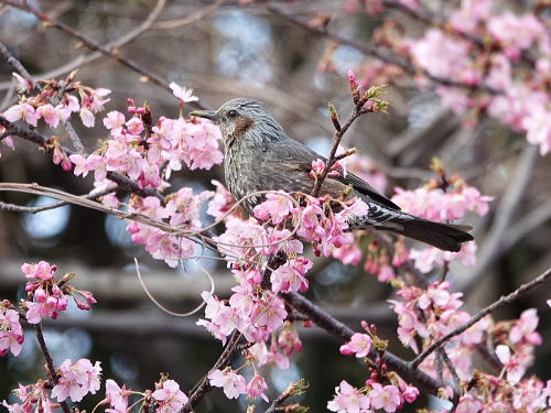 | キセキレイ[3月2日] 用水路の常連です。 | ヒヨドリ[3月2日] カワヅザクラが咲きました。早速ヒヨドリが蜜を吸いに来ました。 | |