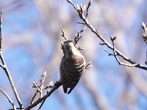 | ソメイヨシノ[3月25日] 木により違いますがたくさん咲いている枝がありました。 | ヤマガラ[3月22日] 2羽で飛び回っていました。 | |
