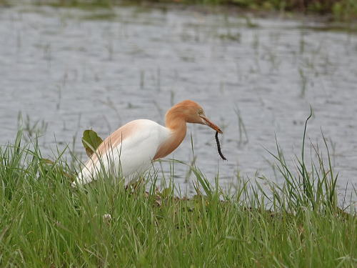 | アマサギ[5月15日] 2羽が採餌中でした。 | アマサギ[5月15日] ムカデのような虫を獲りました。 | |