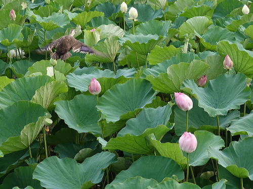 | 鶴岡八幡宮の七夕[7月7日] 源平池のハス、カルガモが逃げて行きました。 |