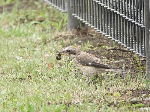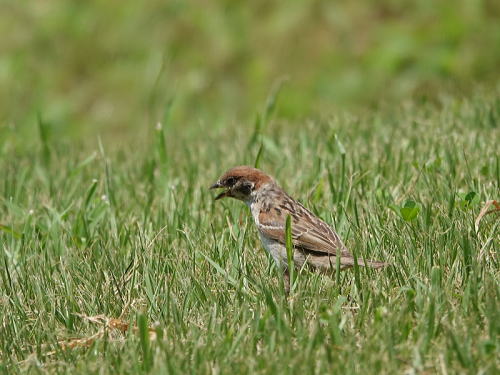 | スズメ[7月22日] 幼鳥です。数羽が芝生で採餌中でした。 |